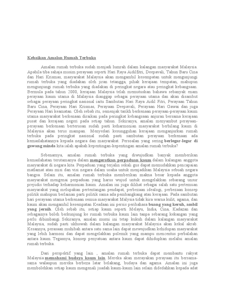 Sebenarnya amalan rumah terbuka yang diwujudkan banyak memberikan kepentingan terutamanya dalam memperkenalkan budaya dan adat resam kaum lain di Negara kita. KARANGAN CEMERLANG SPM - Kebaikan Amalan Rumah Terbuka Kebaikan Amalan Rumah Terbuka Amalan rumah terbuka sudah menjadi lumrah untuk sambutan perayaan di negara ini termasuk Hari Raya Aidilfitri Deepavali Tahun Baru Cina dan Hari Krismas.
